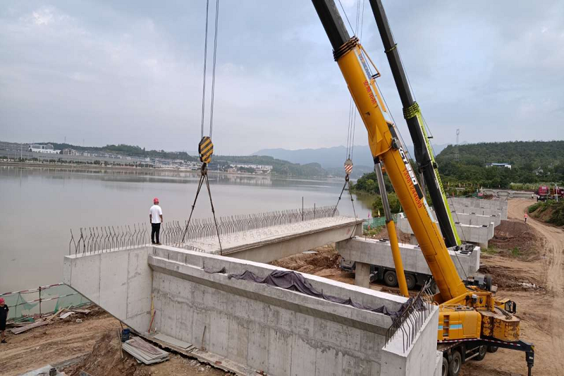 8月14日清早,,,,陪同着阵阵机械轰鸣声,,,,省道205线广元至昭化镇公路改建工程首片预制箱梁清静、平稳地架设在桥墩上,,,,标记着该项目建设正式进入桥梁上部结构施工阶段,,,,向主体工程建设提速、为早日建成通车的目的迈出了坚实的一步。。