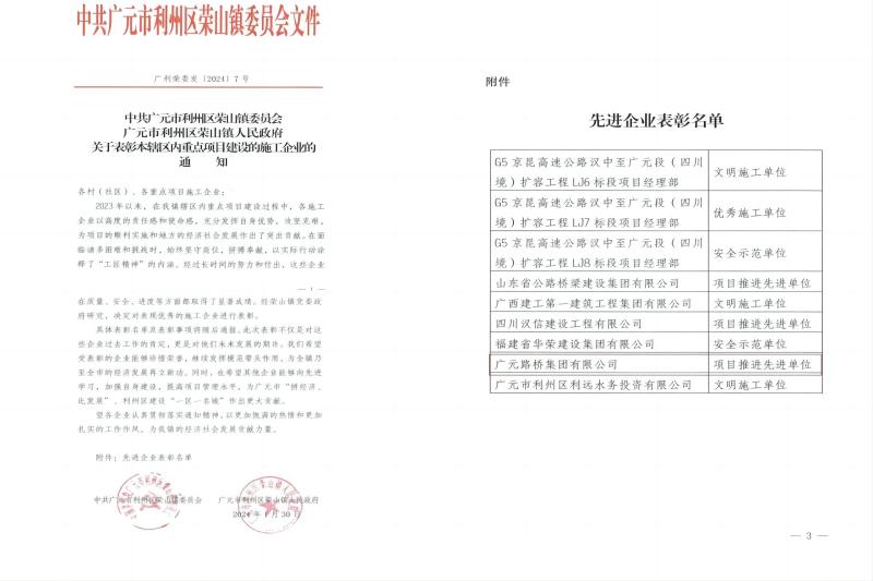 1月30日,,公司收到利州区荣山镇委员会、荣山镇人民政府发来的关于表扬本辖区内重点项目建设的施工企业的通知{广利荣委发(2024)7号},,ibet集团被点名表扬,,ibet集团荣山镇高坑口至周家坝项目部在面临建设前期诸多难题和挑战时,,迎难而上,,发挥拼搏贡献,,以现实精神诠释了“工匠精神”的内在。。。。