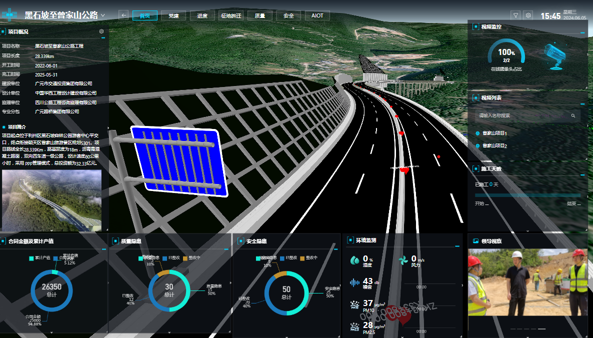 为强化危害管控,,,,黑曾路项目部引入智慧信息化可视治理平台,,,,综合运用BIM、GIS、物联网、大数据、人工智能、无人机等先进手艺,,,,构建基于BIM+GIS+IOT+AI+PM的智慧工地平台,,,,实现进度、质量、清静等全方位智能化管控。。。。